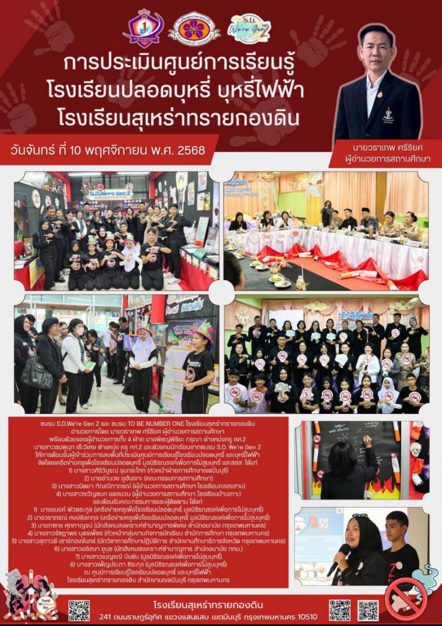 วันจันทร์ที่ 10 พฤศจิกายน พ.ศ. 2568 ชมรม S.D.We?re Gen Z โรงเรียนสุเหร่าทรายกองดิน อำนวยการโดย นายวราเทพ ศรีธิยศ ผู้อำนวยการสถานศึกษา พร้อมด้วยรองผู้อำนวยการทั้ง 4 ฝ่าย นายพิชญ์พิริยะ กรุณา ตำแหน่งครู คศ.2 นางสาวชมพูนุท เซ๊ะวิเศษ ตำแหน่ง ครู คศ.2 และตัวแทนนักเรียนจากชมรม S.D. We?re Gen Z ให้การต้อนรับผู้เข้าร่วมการลงพื้นที่ประเมินศูนย์การเรียนรู้โรงเรียนปลอดบุหรี่ และบุหรี่ไฟฟ้า จัดโดยเครือข่ายครูเพื่อโรงเรียนปลอดบุหรี่ มูลนิธิรณรงค์เพื่อการไม่สูบบุหรี่ และสสส. ได้แก่ 1) นางสาวศิริวิบูรณ์ รุนกระโทก (หัวหน้าฝ่ายการศึกษาเขตมีนบุรี) 2) นายอำนวย ยูฮันเงาะ (คณะกรรมการสถานศึกษา) 3) นางสาวนิตยา กัณณิกาภรณ์ (ผู้อำนวยการสถานศึกษา โรงเรียบคลองสาม) 4) นางสาวขวัญชนก แดงนวน (ผู้อำนวยการสถานศึกษา โรงเรียนบ้านเกาะ) และต้อนรับคณะกรรมการและผู้ติดตาม ได้แก่ 1) นางอนงค์ พัวตระกูล (เครือข่ายครูเพื่อโรงเรียนปลอดบุหรี่ มูลนิธิรณรงค์เพื่อการไม่สูบบุหรี่) 2) นางวราภรณ์ หงษ์ดิลกกุล (เครือข่ายครูเพื่อโรงเรียนปลอดบุหรี่ มูลนิธิรณรงค์เพื่อการไม่สูบบุหรี่) 3) นายกชกร ศุภกาญจน์ (นักสังคมสงเคราะห์ชำนาญการพิเศษ สำนักอนามัย กรุงเทพมหานคร) 4) นางสาวรัชฎาพร บุตรเพ็ชร (หัวหน้ากลุ่มงานกิจการนักเรียน สำนักการศึกษา กรุงเทพมหานคร) 5) นางสาวสุภาวดี เสาร์ทองจันทร์ (นักวิชาการศึกษาปฏิบัติการ สำนักงานศึกษาธิการจังหวัด กรุงเทพมหานคร) 6) นางสาวอลิสษา ยูนุช (นักสังคมสงเคราะห์ชำนาญการ สำนักอนามัย กทม.) 7) นางสาวเบญจณี บินชัน (มูลนิธิรณรงค์เพื่อการไม่สูบบุหรี่) 8)นางสาวเพ็ญประภา ชิระกุล (มูลนิธิรณรงค์เพื่อการไม่สูบบุหรี่) ณ ศูนย์การเรียนรู้โรงเรียนปลอดบุหรี่ และบุหรี่ไฟฟ้า โรงเรียนสุเหร่าทรายกองดิน สำนักงานเขตมีนบุรี กรุงเทพมหานคร S:0
