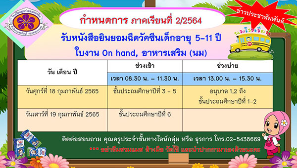 ประชาสัมพันธ์กำหนดการ รับหนังสือยินยอมฉีดวัคซีนเด็กอายุ 5-11 ปี ใบงาน On hand, อาหารเสริม (นม) ภาคเรียนที่ 2/2564
