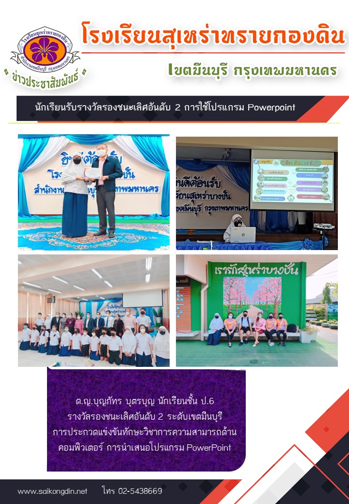รางวัลรองชนะเลิศอันดับ 2 ระดับเขตมีนบุรี การประกวดแข่งขันทักษะวิชาการความสามารถด้านคอมพิวเตอร์ การเขียนใช้โปรแกรมนำเสนอ powerpoint