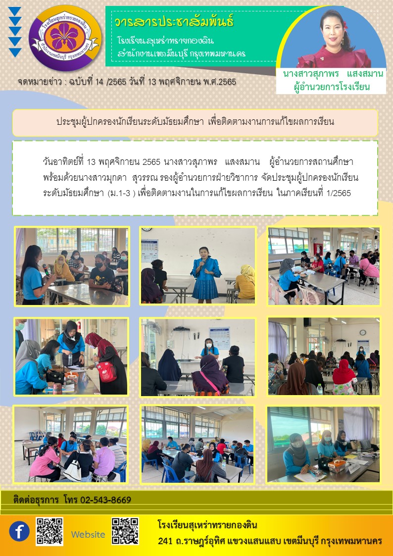 วันอาทิตย์ที่ 13 พฤศจิกายน 2565 นางสาวสุภาพร   แสงสมาน    ผู้อำนวยการสถานศึกษาพร้อมด้วยนางสาวมุกดา  สุวรรณ รองผู้อำนวยการฝ่ายวิชาการ จัดประชุมผู้ปกครองนักเรียนระดับมัธยมศึกษา (ม.1-3 ) เพื่อติดตามงานในการแก้ไขผลการเรียน ในภาคเรียนที่ 1/2565
